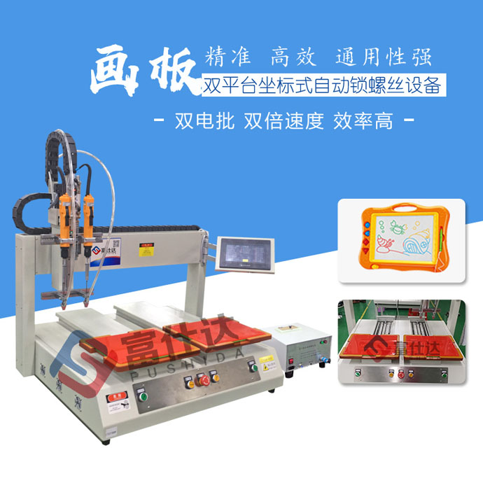 兒童畫板自動(dòng)鎖螺絲機(jī)采用富仕達(dá)雙平臺(tái)坐標(biāo)式,配置2把電批一次同時(shí)擰好2顆螺絲,效率提升2倍,設(shè)計(jì)可調(diào)式夾具,滿足多產(chǎn)品生產(chǎn)要求。